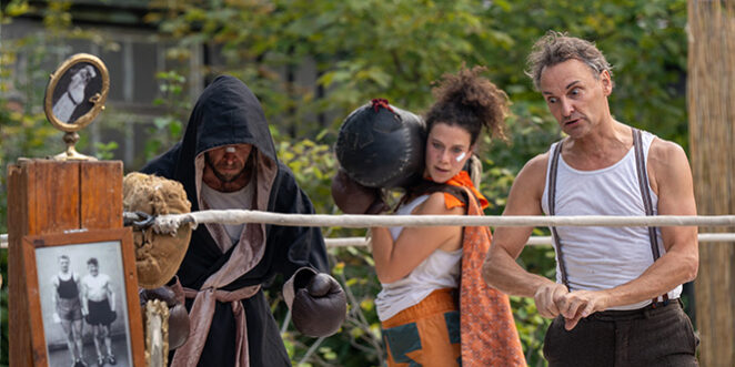 Peek-a-Boo! est un match de boxe burlesque où se mêlent acrobaties spectaculaires et gags irrésistibles. Une bagarre joyeuse et un festival de gags, avec une bonne dose de burlesque et de poésie. Le spectacle se joue dans un authentique ring de boxe, à l’extérieur, sous les projecteurs, sous un chapiteau ou en intérieur. Peu importe où, le rire et l’énergie sont garantis !